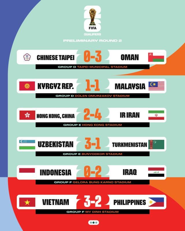 在6日第五轮的18场比赛结束之后,六支球队又顺利地提前一轮拿到了第三阶段的参赛资格。韩国队在客场7比0击败新加坡队之后,顺利从第三小组杀入18强赛;第四小组的阿曼队客场3比0取胜中国台北队,锁定一个出线席位;第七小组的沙特队客场3比0拿下巴基斯坦队、约旦队主场3比0取胜塔吉克斯坦队,双双晋级下一阶段,而亚洲杯赛上的“黑马”塔吉克队,最终被证明只是昙花一现。
