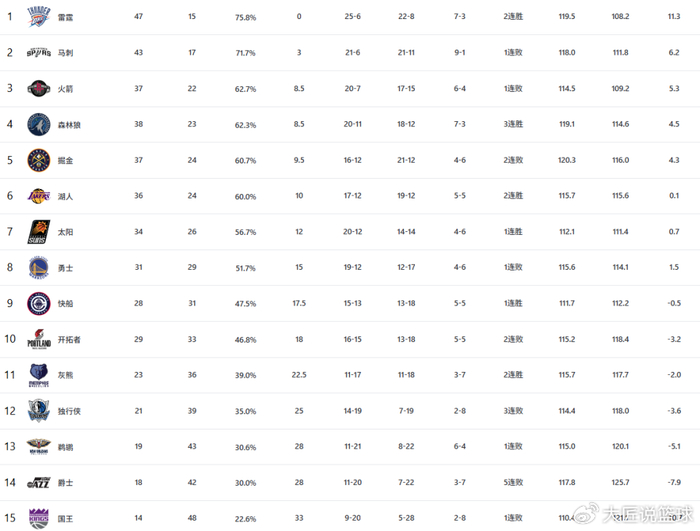 1-2名:雷霆(47胜15负)和马刺(43胜17负)
